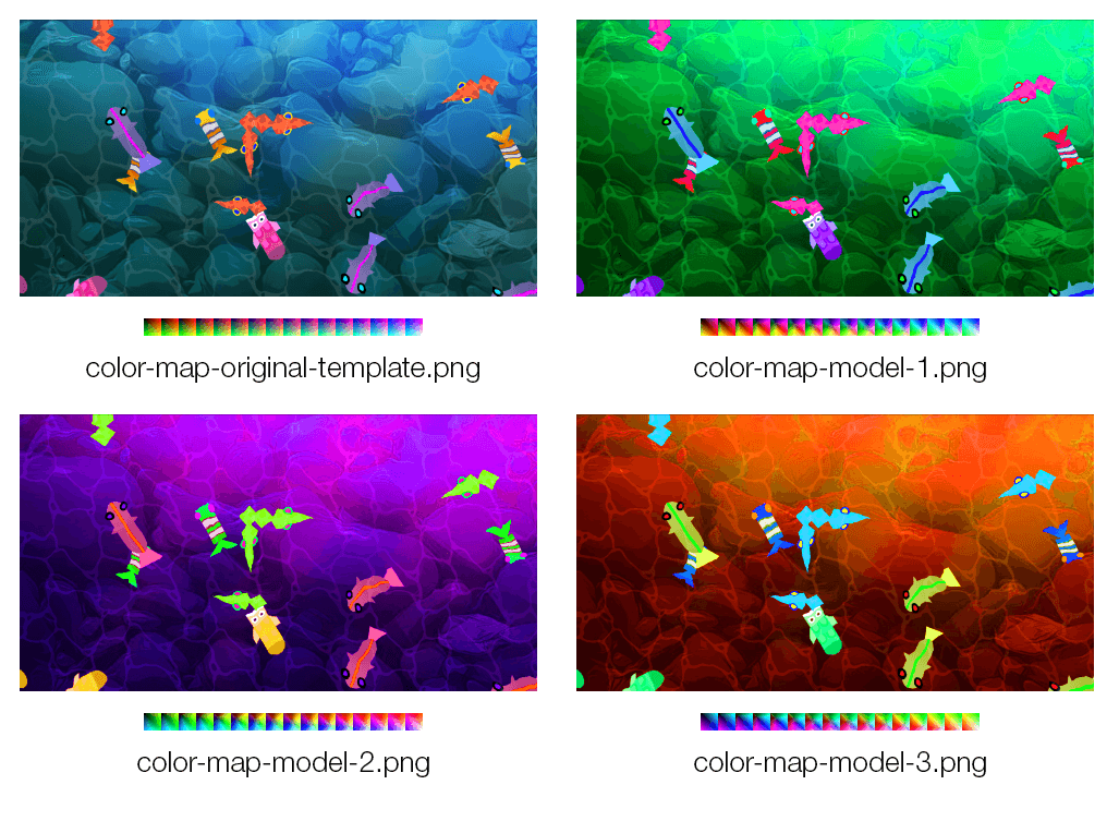 Each example color map below relates to the images above with the same name. By shifting the original template's colors, it shifts the colors of all of the objects on that layer.